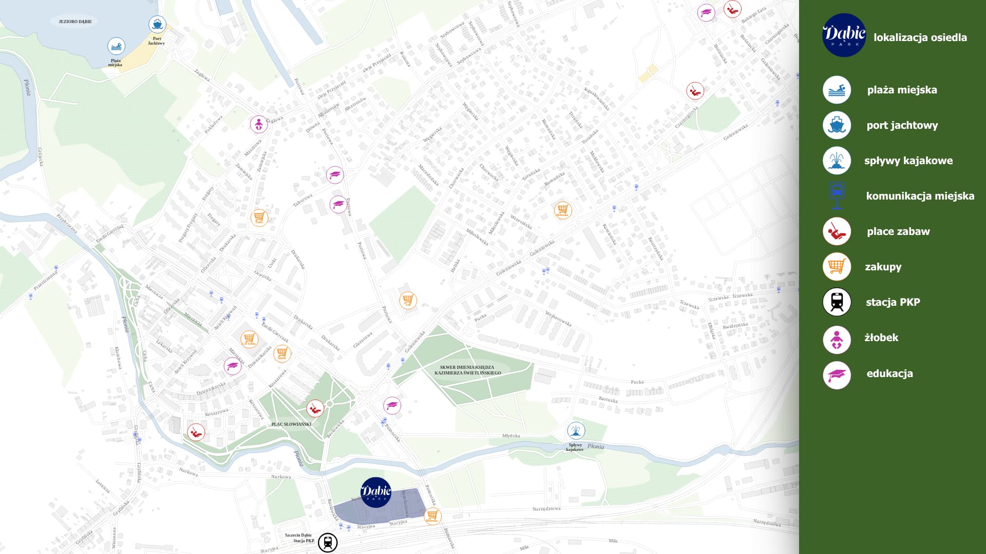 Dąbie Park to nowa inwestycja na Prawobrzeżu Szczecina, położona w zielonej części dzielnicy Dąbie, w pobliżu rzeki Płonia. To idealne miejsce dla osób, które szukają mieszkania w spokojnej okolicy, a jednocześnie chcą mieć szybki dostęp do centrum miasta.